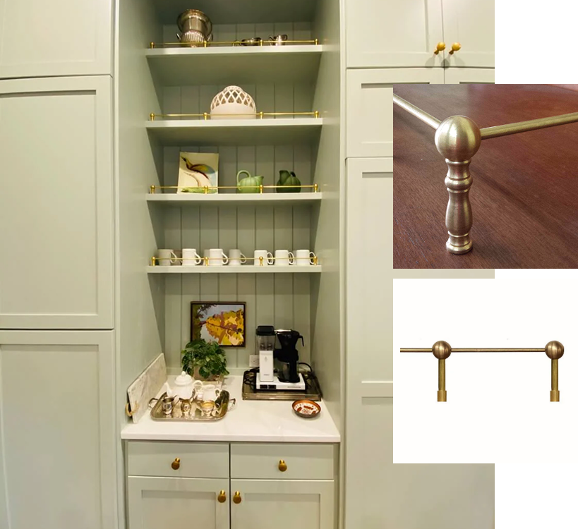 Versatile brass railings transform open shelving into a refined display. Designed as a modular rod-and-post system, they work beautifully on kitchen cabinets, bar backs, bookshelves, and furniture pieces like sideboards and bureaus. Choose from six distinct styles, each offers its own visual character and mounting approach. The key to selecting the right style is first determining your preferred attachment method—whether you're securing to wood, metal, or another surface—then matching it to a railing design that accommodates that installation. This thoughtful approach ensures a secure fit and a polished finish that complements your space.